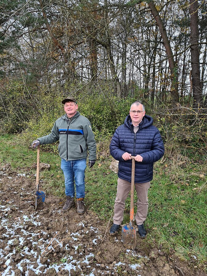 Förster Willi Weber und Bürgermeister Günther Pfefferer pflanzen Elsbeeren.