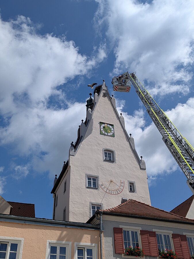 Im Gerstner-Nest befinden sich zwei Jungstörche, am Oberen Torturm hat aus der Brut ein Jungstorch überlebt.