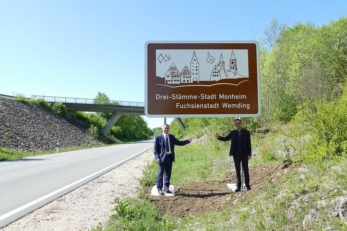 Seit Ende April werden die beiden Städte Wemding und Monheim durch ein gemeinsames touristisches Hinweisschild an der Bundesstraße 2 (Höhe Ausfahrt Monheim) beworben. Je ein Schild von Süden kommend Richtung Weißenbug i. B. und ein Schild von Norden Richtung Donauwörth kommend, wurden vom Staatlichen Bauamt Augsburg auf gemeinsamen Antrag der beiden Städte angebracht. Auf den sog. „touristischen Hinweisschildern“ mit typischem braunem Hintergrund und weißer Schrift sind symbolisch die Jurastadt und die Wallfahrtsstadt abgebildet. Hinzu kommen der Untertitel „Drei-Stämme-Stadt Monheim“ sowie „Fuchsienstadt Wemding“.
