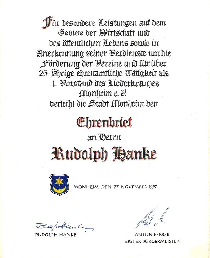 Auszeichnung mit dem Ehrenbrief der Stadt Monheim am 27. November 1997