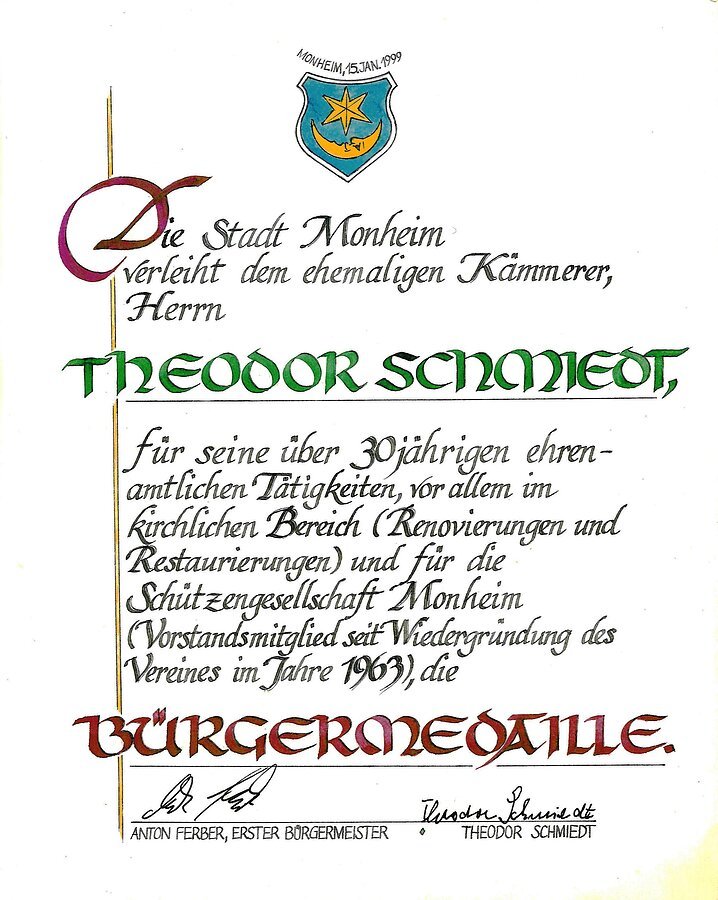 Auszeichnung mit der Bürgermedaille der Stadt Monheim am 15. Januar 1999