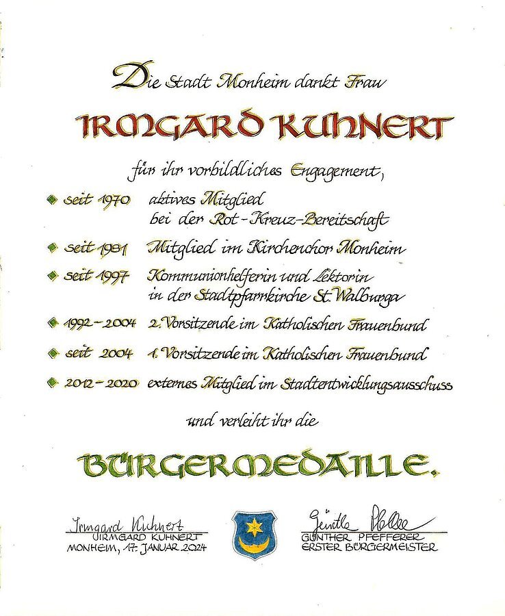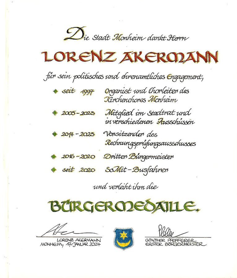 Auszeichnung mit der Bürgermedaille der Stadt Monheim am 17. Januar 2024