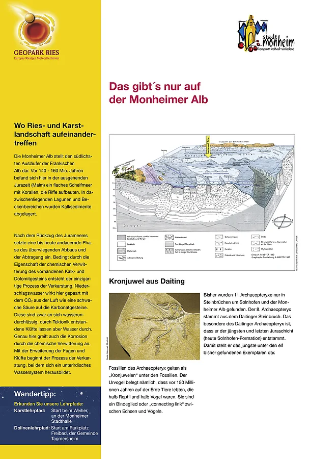 Mehrere Schautafeln stellen einen interessanten Erstkontakt zum Geopark Ries her und verschaffen Besuchern und Besucherinnen einen Überblick, von welchen Standorten aus Besucher die Kraterstruktur im Gelände besonders gut erkennen können. Daneben überrascht die Geopark Infostelle Monheim mit einer Vielzahl „lokaler“ Themen: Das im nahe gelegenen Steinbruch Otting untersuchte Suevitgestein verwandelte den Vulkankrater Nördlinger Ries quasi „über Nacht“ zum Meteoritenkrater. Schautafeln zeugen von den Karstformen der Monheimer Alb, dem südlichsten Ausläufer der Frankenalb. Die Auswirkungen des Riesereignisses auf die Monheimer Alb und die spannende Landschaftsgeschichte um das verschüttete Tal des Urmains bei Monheim runden das Wissens-Spektrum der Monheimer Geopark Infostelle ab.