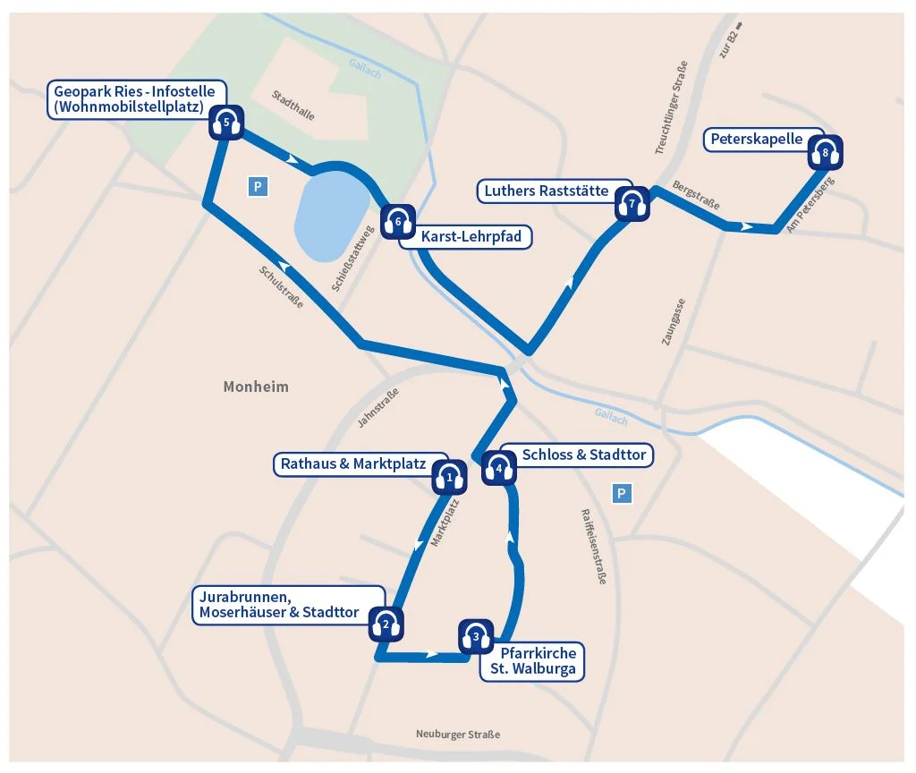 Dort befinden sich die Starttafel mit einigen Informationen und den einzelnen Stationen der Lauschtour sowie der erste "Lauschpunkt". Über den Marktplatz geht es weiter bis zum Jurabrunnen und dem Oberen Stadttor. Weitere Stationen in der Altstadt sind die Stadtpfarrkirche St. Walburga und das Monheimer Schloss. Außerhalb der Stadttore führt die Tour zur Geopark Ries-Infostelle, macht Halt vor "Luthers Raststätte", dem ehemaligen Gasthof Lamm, und endet vor der evangelischen Peterskapelle.