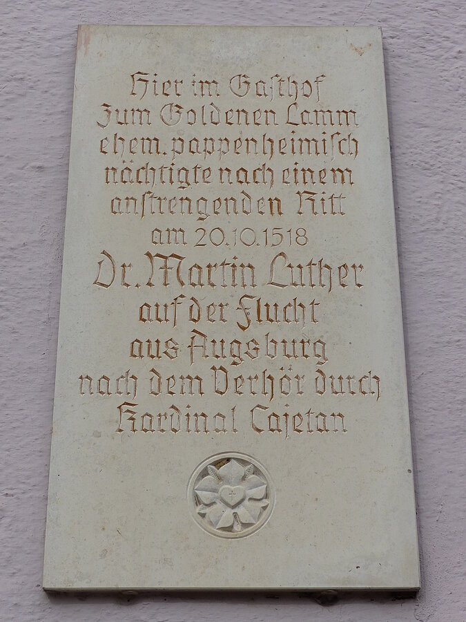 In der Nacht vom 20. auf den 21. Oktober 1518 übernachtet Martin Luther nach einem Verhör durch Kardinal Cajetan in Augsburg auf der Flucht im ehem. Gasthof "Zum goldenen Lamm" in Monheim. Heute erinnert nur noch eine Gedenktafel daran....