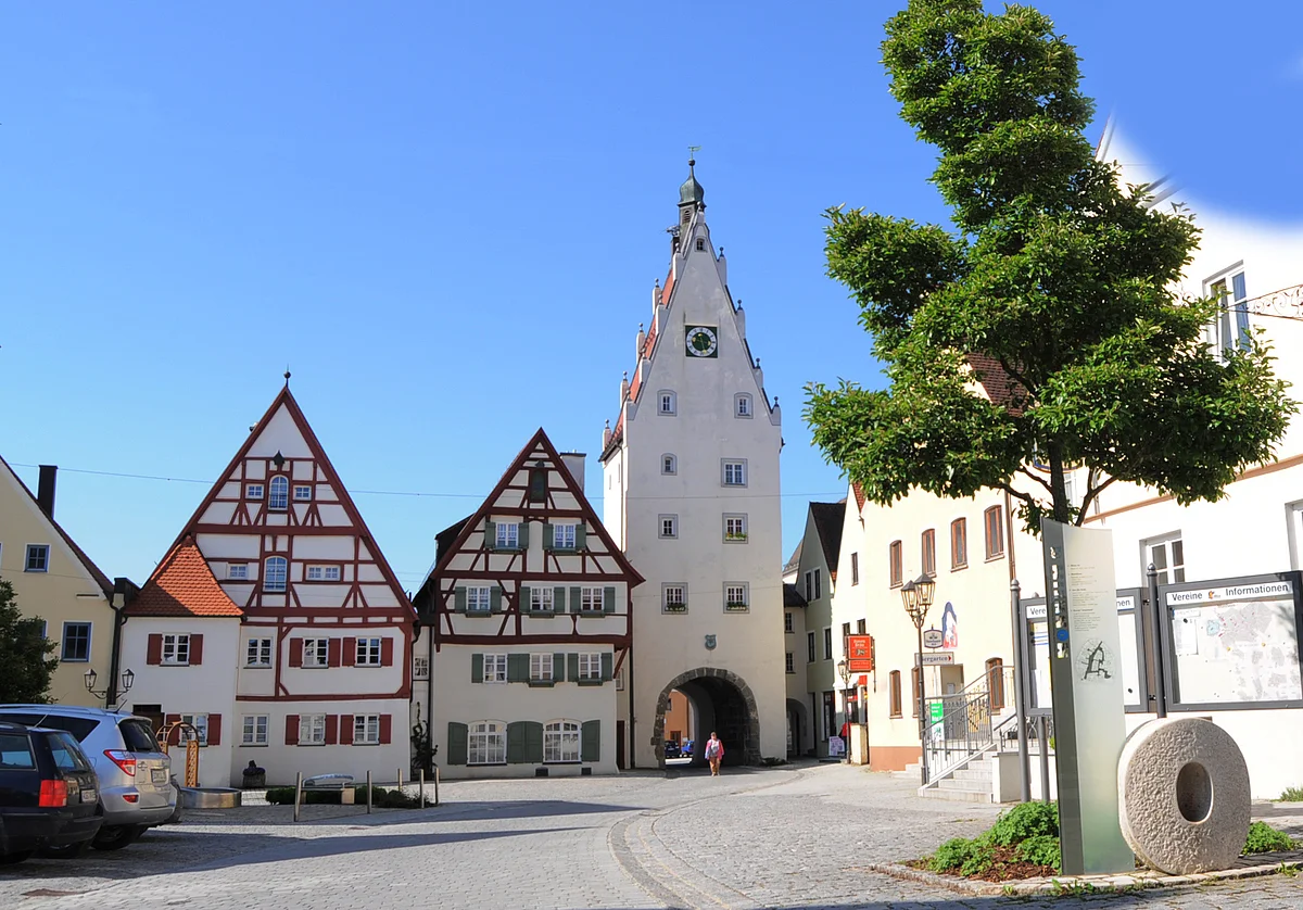 Das "Obere Tor" oder "Donauwörther Tor" wurde um 1350 erbaut und hat eine Höhe von 32 Meter. Der Obere Torturm ist das Wahrzeichen der Stadt Monheim.