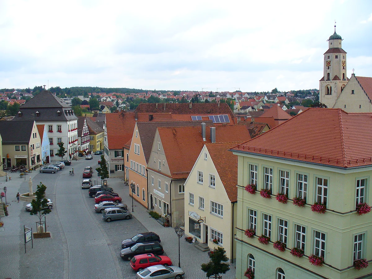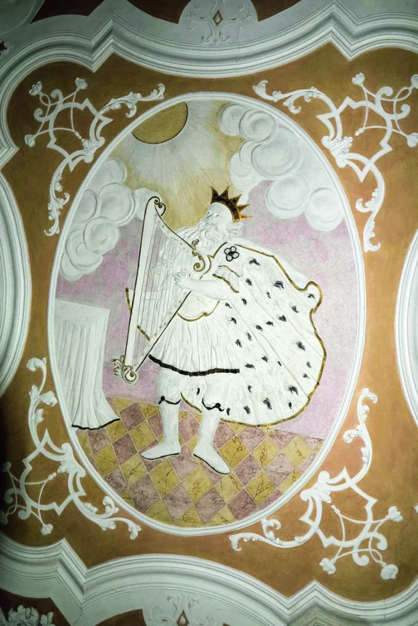 Das Rathaus der Stadt Monheim, am Marktplatz. Ein weißes, dreistöckiges Gebäude mit Satteldach und mehreren Fenstern, im Vordergrund gepflasterter Marktplatz.Decke mit barocker Stuck- und Freskoverzierung in einem hellen Raum mit Fenstern und moderner Beleuchtung.Farbig bemaltes Deckenfresko im Trauungszimmer der Stadt Monheim, das den König David mit einer Harfe in den Händen, einer Krone und Umhang zeigt, umgeben von Wolken und Sonne.Blick auf eine Straße in der Monheimer Innenstadt mit geparkten Autos an der Straße entlang und Fachwerkhäusern mit roten Dächern bei bewölktem Himmel. An der Straße einzelne Bäume gepflanzt, ein Brunnen auf der linken Seite ist zu sehen und auf der rechten Seite eine Kirche.