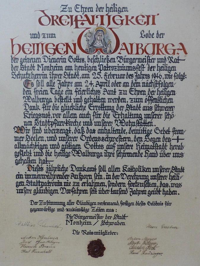 An der Wand der Kapelle hängt eine Urkunde von 1946, in der der Bürgermeister und der Rat Monheims ein alljährliches Dankamt für die Verschonung der Stadt im Zweiten Weltkrieg gelobten.
