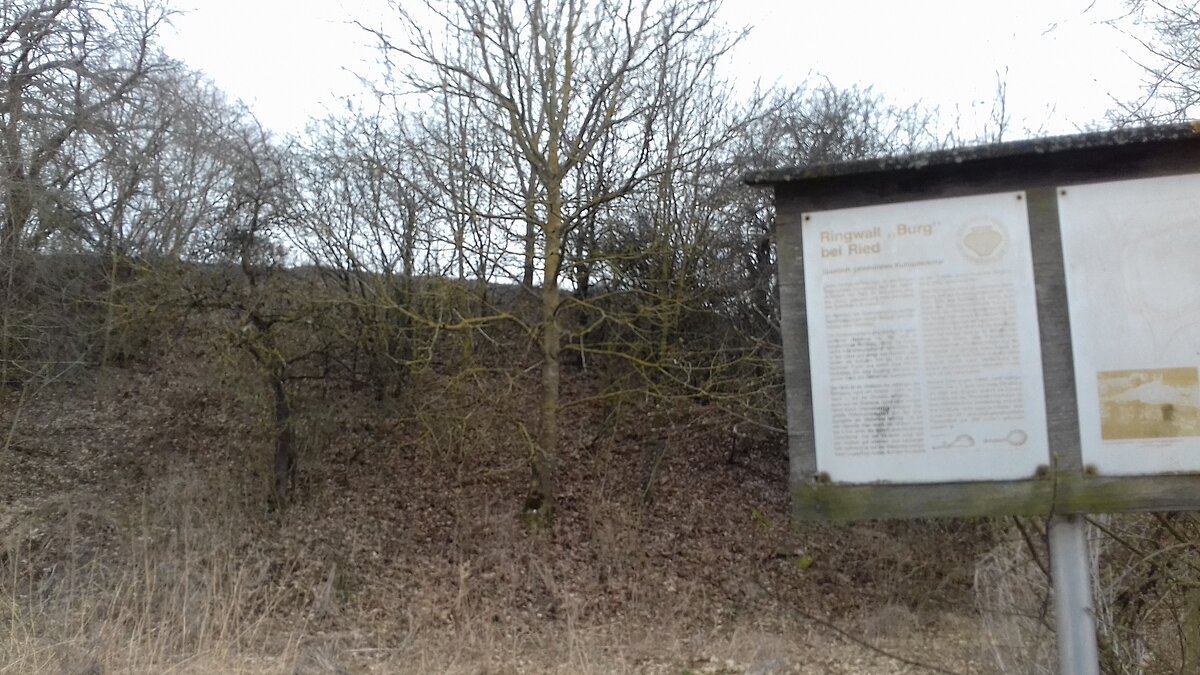 Diese nahezu rechteckige, an den Ecken abgerundete Wallanlage liegt ca. 300 m südöstlich von Ried bei Monheim. Im Volksmund wird sie "Burg" genannt und man vermutete alte Gewölbe u.ä. darunter.