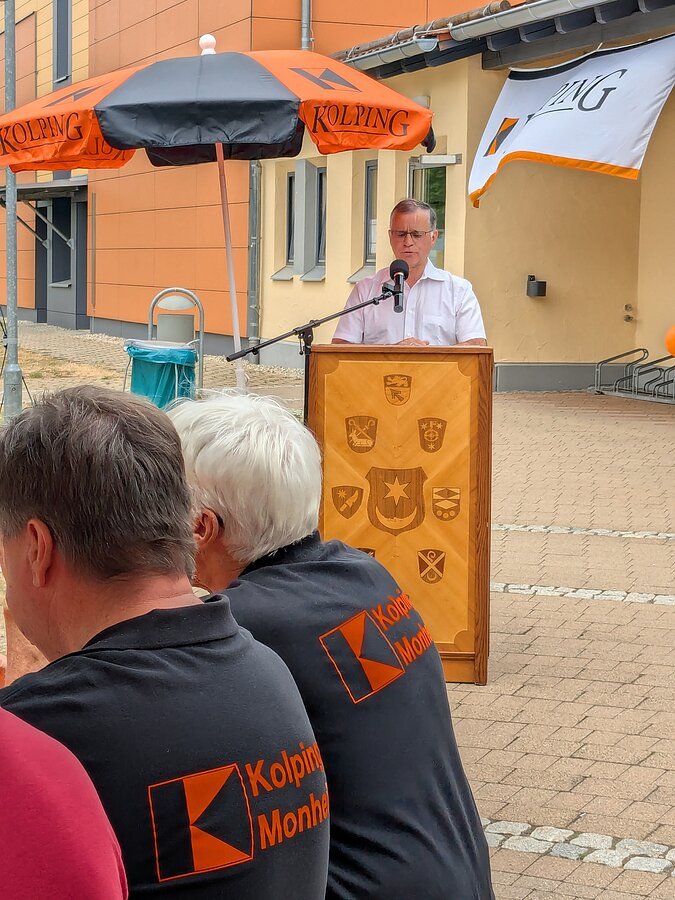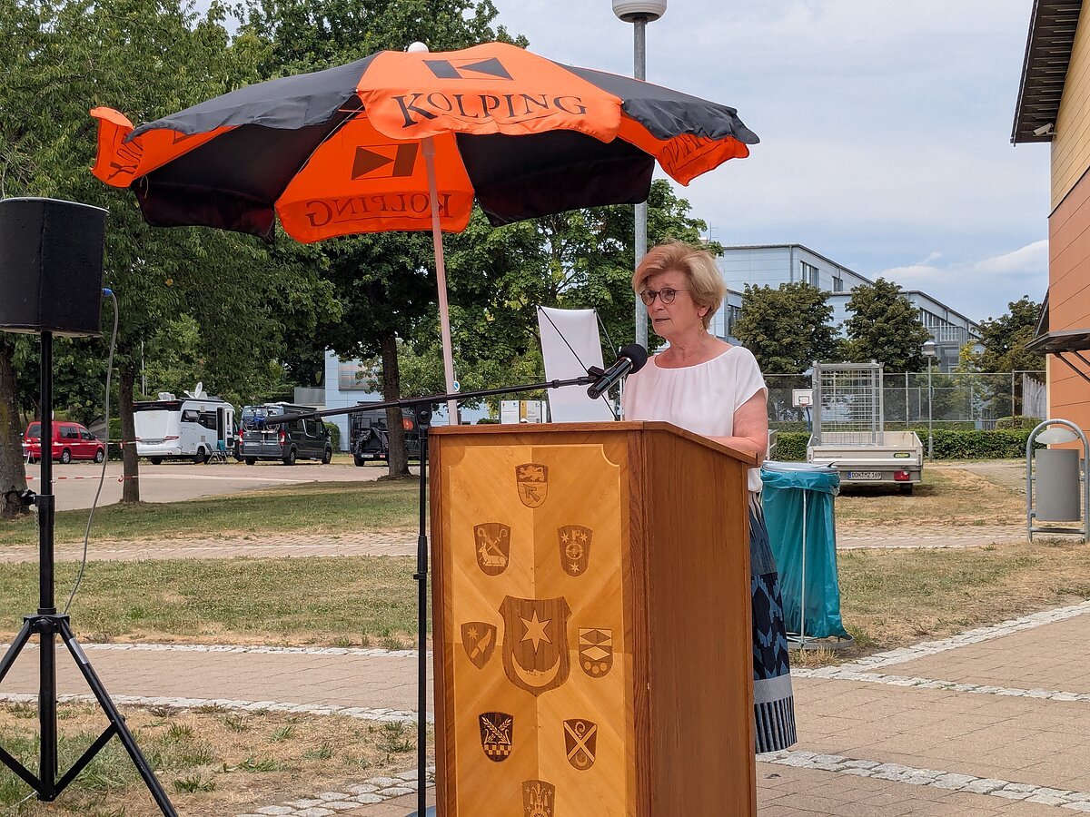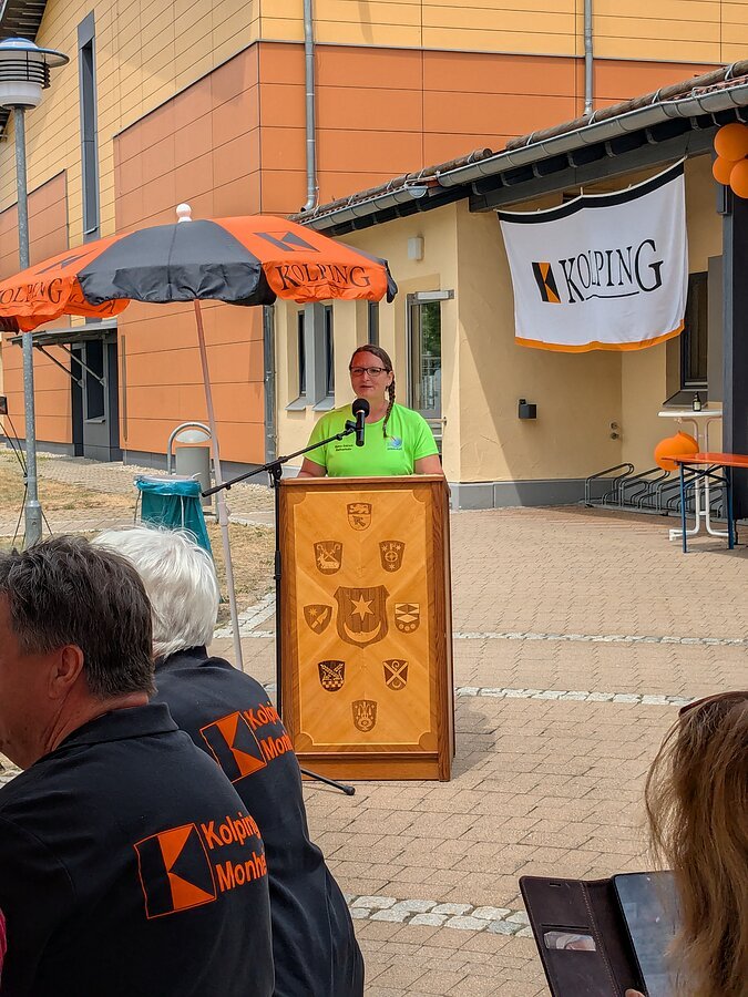 Vor der Stadthalle wurden die Gäste von der Stadt Monheim empfangen. Die Kolpingsfamilie Monheim sorgte für Speis und Trank. Stellvertretende Landrätin Frau Ursula Kneißl-Eder begrüßte die Anwesenden. Sie gratulierte der Kolpingsfamilie Monheim zum 100jährigen Jubiläum und bedankte sich für deren hervorragendes ehrenamtliches Engagement.