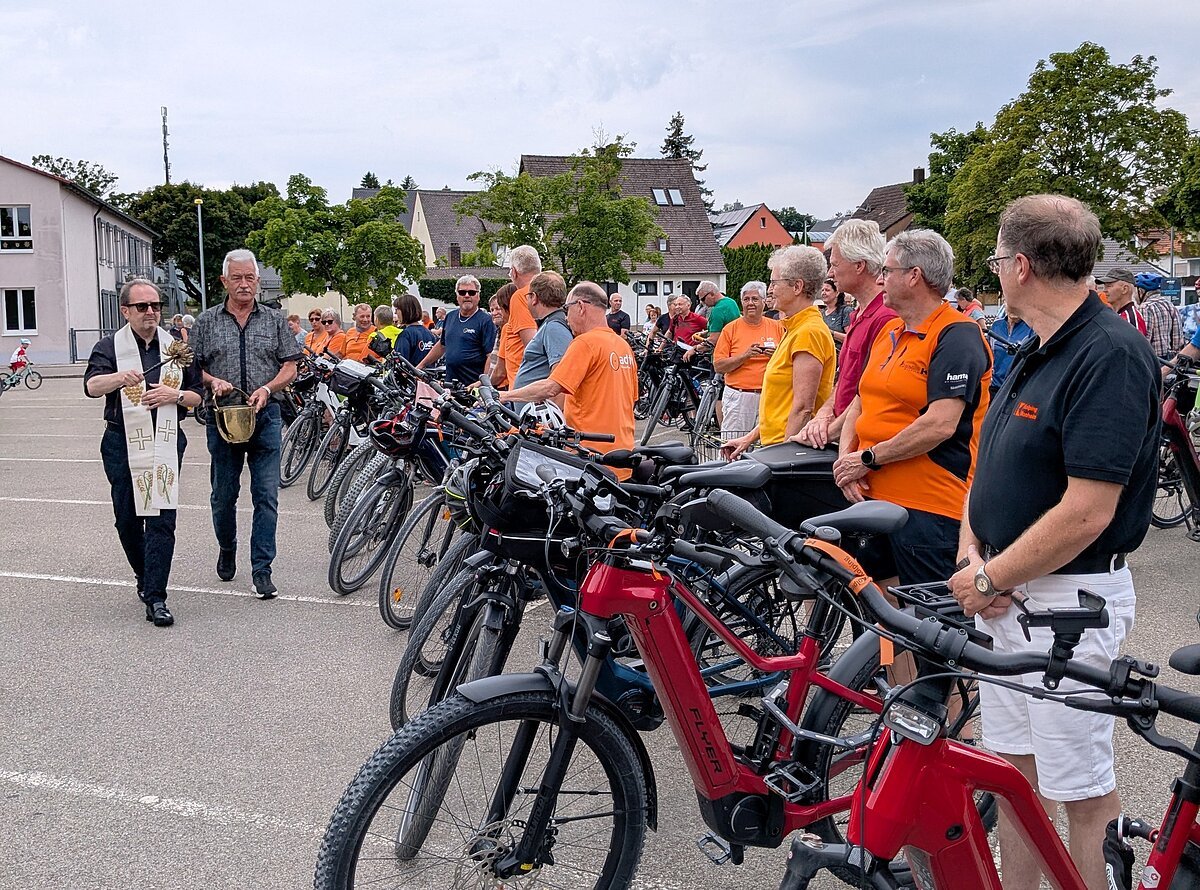 Nach einer kurzen Andacht spendete Stadtpfarrer Michael Maul für alle Radler sowie deren Drahtesel den kirchlichen Segen – für allzeit gute und unfallfreie Fahrt. An allen Rädern wurde ein oranges „Kolping-Band“ als Andenken an diese besondere Fahrradweihe angebracht.
