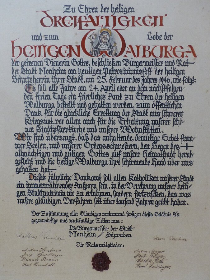 „Zu Ehren der heiligen Dreifaltigkeit und zum Lobe der heiligen Walburga, der getreuen Dienerin Gottes, beschließen Bürgermeister und Rat der Stadt Monheim am heutigen Patroziniumsfest der heiligen Schutzherrin ihrer Stadt, am 25. Februar des Jahres 1946, wie folgt: