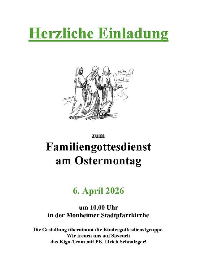Herzliche Einladung zur feierlichen Maiandacht der Kigo-Gruppe am Freitag, den 1. Mai 2026 um 18:00 Uhr in der Stadtpfarrkirche in Monheim mit Prozession zu unserer Marienstatue. Es freuen sich auf Ihr/euer Kommen Stadtpfarrer Michael Maul und die Kindergottesdienstgruppe. (Lydia Pfefferer) ...